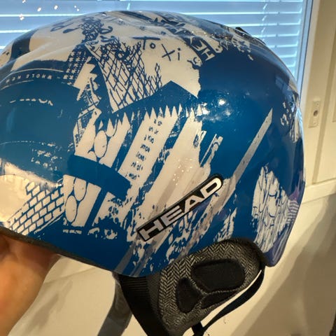Nelisen vuotta vanha kypärä, jokunen naarmu ja jälki pinnassa.