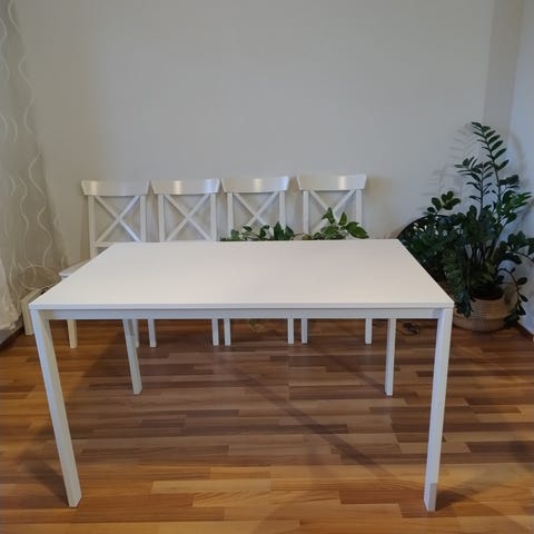 Myytävänä lasikantinen, metallirunkoinen pöytä. Runko valkoinen, lasikansi etsattu ("maitolasi").