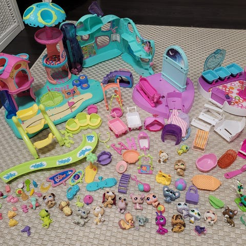 Littlest Pet Shop erikokoisia hahmoja, taloja, hahmojen vaatteet ja lelut, leikkisetit. sisältää useita pieniä eläinhahmoja ja erilaisia leikkitalon osia.