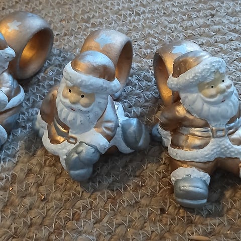 Puiset vanhat joulupukit vaikka takanreunalle koristamaan. Ajan tuomaa kulumaa.