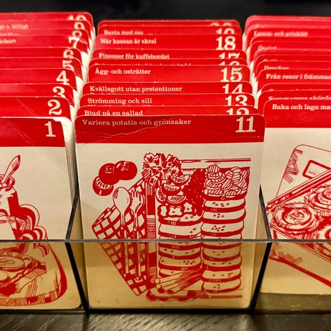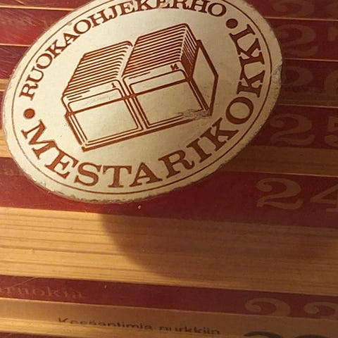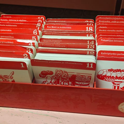 Ruokaohjekerho Mestarikokin (70-luku), todennäköisesti täysi korttisarja. Korttipakka ehjässä säilytyslaatikossa, kortit on numeroitu ja järjestetty laatikkoon selkeästi. Kortit hyvässä kunnossa.