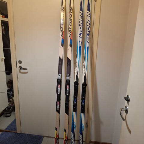 Salomon sukset 161cm. NNN-siteet. Suomukuvio pitoalueella. Vanhat mutta toimivat.