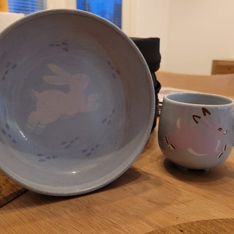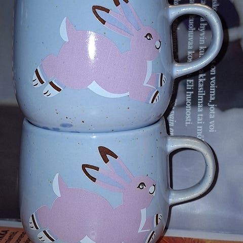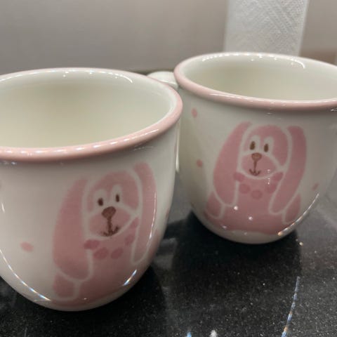 näillä voi joku viitsivä lyödä rahoiksi, esimerkiksi tälläkin hetkellä vastaava pupu-muki myynnissä etsyssä 45€ hintaan.