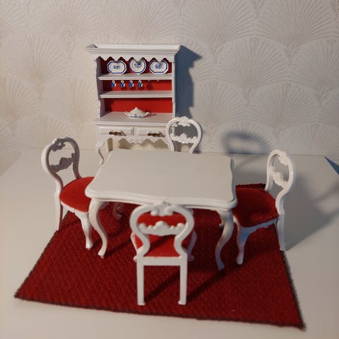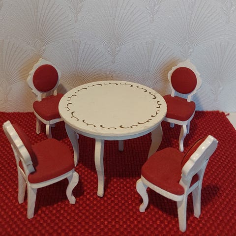 Kauniit, vanhat, puiset rokokoo-kalusteet nukkekotiin.