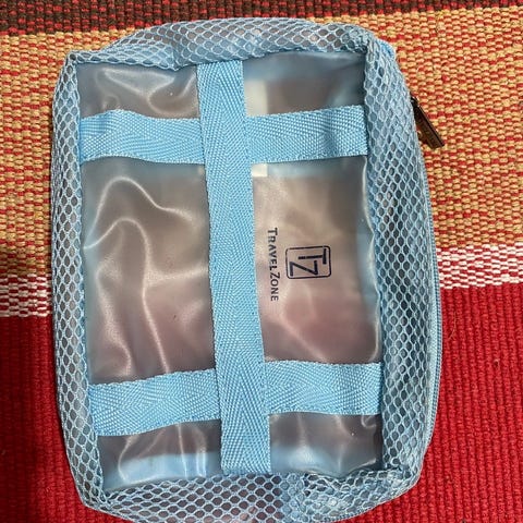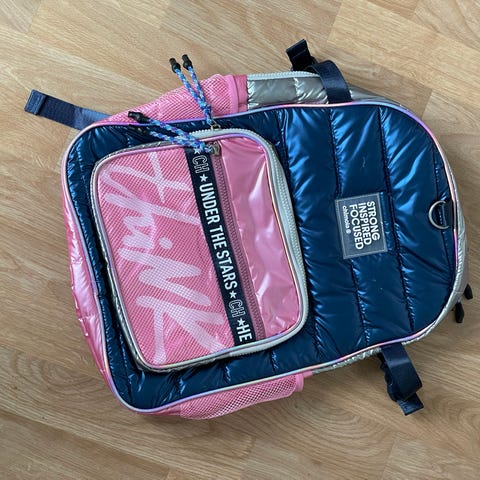 Vaaleansininen InterSport-vaellusreppu, jonka saa helposti pystyyn metalliosiensa varaan. Hinta 2,5 euroa.