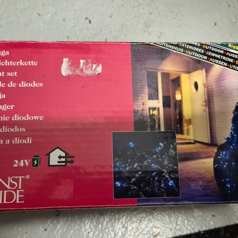 Ulko- tai sisäkäyttöön soveltuva 5,4m pitkä valosarja, jossa 50 LED-valoa. Toimii pattereilla. Täysin ehjä. Myydään ilman pattereita ja ilman kuvassa näkyvää säilytyslaatikkoa.