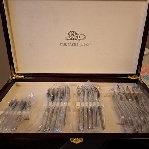 Myydään tarpeettomana käyttämätön Ristomatti Ratian suunnittelema Kultakeskuksen Palava-aterinsetti, jossa on 24 osaa. Valmistettu ruostumattomasta teräksestä. Setti sisältää veitset, haarukat, ruokalusikat ja teelusikat, jokaista 6kpl. Soveltuvat päivittäiseen käyttöön. Toimitetaan alkuperäisessä pakkauksessa. Nouto Lahdesta tai tarvittaessa kulkeutuu menojen mukaan pääkaupunkiseudulle.