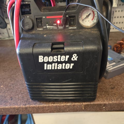 Järeä pyörillä kulkeva akkulaturi ja ilmeisesti joku starttiominaisuuskin löytyy. Ostaja tietää mitä ostaa ja miten tälläistä käyttää. Minä en tiedä muutakun että 14 volttia näytti tulevan kaapeleihin.