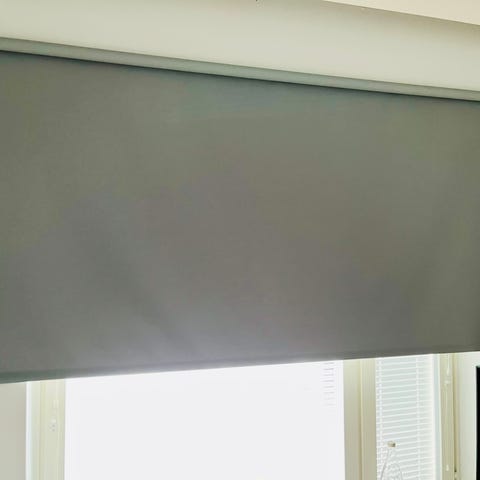 Valkoinen pimennysrullaverho. Muuten Hyvässä kunnossa,mutta verhon alareunassa on tahroja mitkä ei ole lähteny pyyhkimällä pois. Kiinnikkeet tulee mukana.