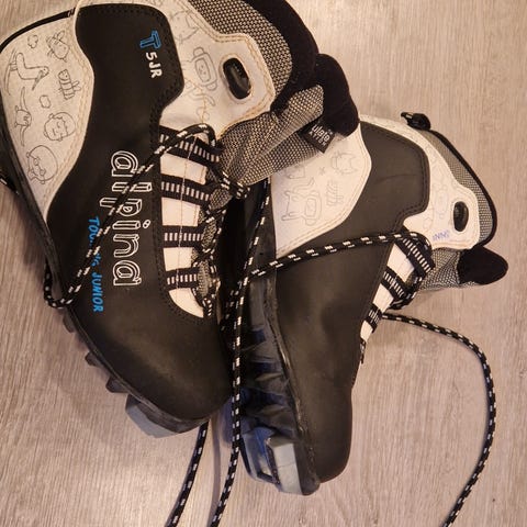 Alpina Touring -merkkiset hiihtomonot, koko 36. Oikeanjalan monon suojaosa on hieman revennyt (näkyy kuvassa), mutta ei haittaa käyttöä. Vielä menee seuraavalle hiihtäjälle.