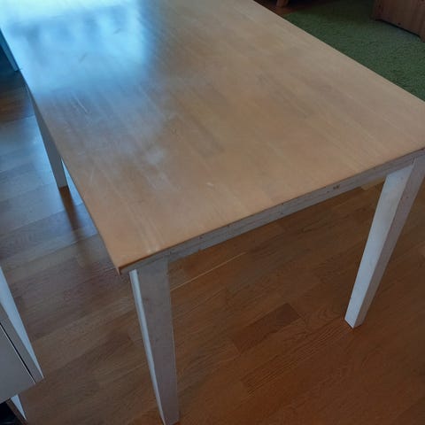 Pöydässä on pieniä käytön jälkiä (pieniä kolhuja), mutta se on tukeva ja palvelee vielä pitkään.