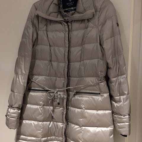 Myydään vain pari kertaa käytetty Resetin laadukas untuvatakki. Hieno istuva leikkaus ja tyylikkäät mustat vetoketjut. Hupun karvan saa halutessaan pois. Väri beige. Koko 36.