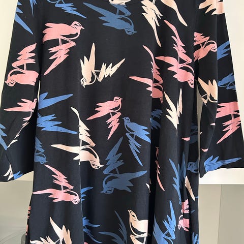 Sini-musta Me&I ohut trikoinen lintumekko vyöllä, koko L. Todella siisti kunto. Ihana mekko!