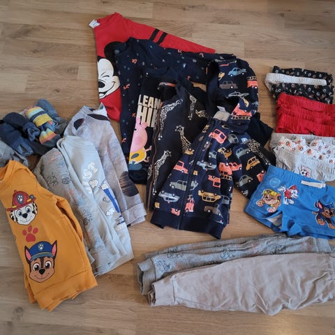 Eri merkkejä. Kaikki ehjiä paitsi yhdessä vihreässä dinosaurus pitkähihaisessa edessä pari reikää. Disney collegepaidassa hihassa jotain tussia. Lindex pesukarhu collegepaidan värit haalistuneet. Yhtien collegehousujen lahkeessa mini rasvatahra.