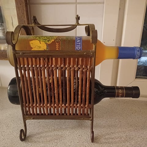 Puinen viinipulloteline, joka taittuu haitariksi. Ideaali 10 mehu- tai viinipullon säilytykseen ja järjestämiseen kellarissa tai keittiössä. Muistelen, että tuote olisi ostettu IKEAsta.