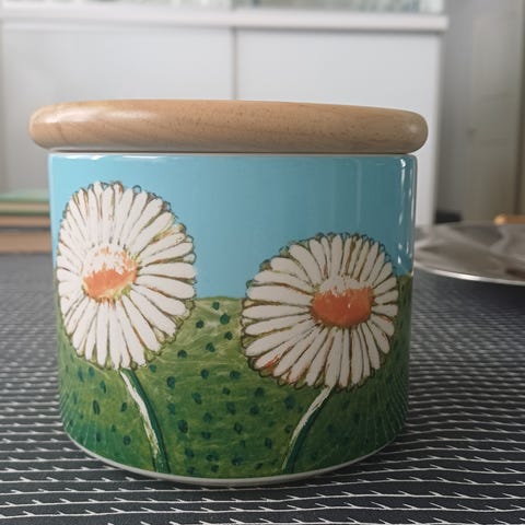 Myydään Arabialle Heljä Liukko-Sundströmin suunnittelema kannellinen säilytyspurkki vuodelta 2010. Aiheen nimi: Aurinkoa kohti.
