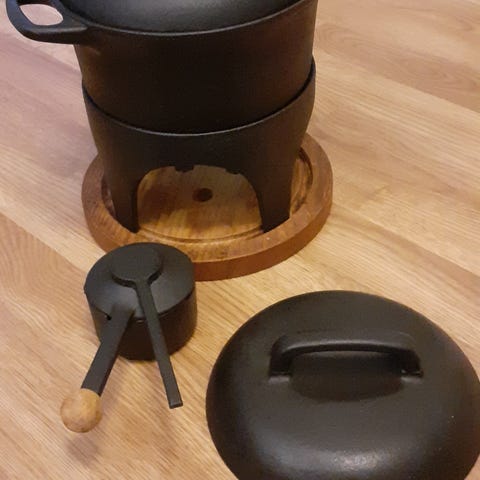 Erinomaisessa kunnossa oleva fonduepata, valmistettu arviolta 70-luvulla Japanissa. Padan tilavuus on 2 litraa.
