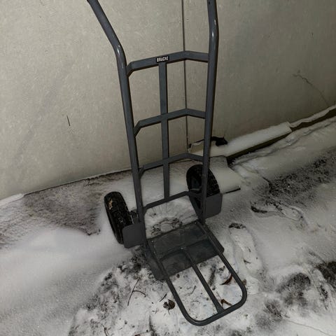 Nokkakärry Magasinsvagn Handtruck sininen. Kantavuus enintään 200 kg. Varustettu kahvoilla ja pyörillä helpottamaan raskaiden esineiden siirtämistä. Hyvin vähän käytetyt ehjät nokkakärryt
