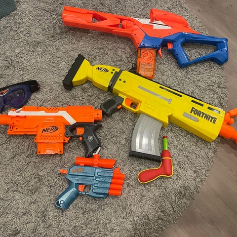4kpl nerf-pyssyjä ja yksi x-shot. Kahdet suojalasit joista toisista logo irronnut.