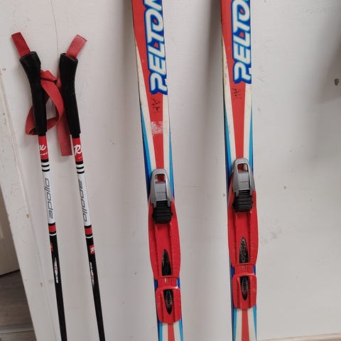Perinteinen pitosuksi kestävillä metallivahvikkeisillä kenkäsiteillä ja lasikuitusauvoilla, joissa muovinen turvasompa. Pituus 110 cm.