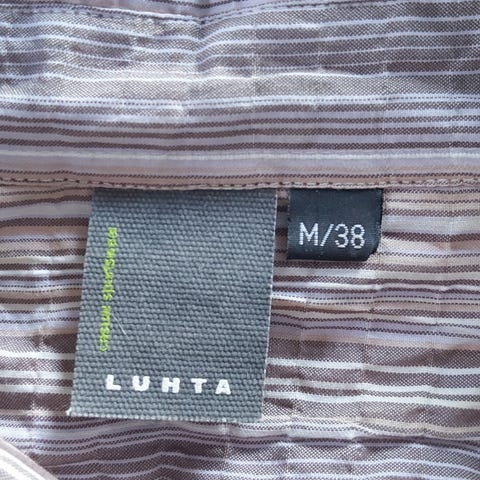 Luhta hiekan värinen / vaaleanruskea 100% viskoosipusero koko 42. Ohutta, kauniisti laskeutuvaa kangasta. Puserossa on vajaamittaiset hihat, jotka saa napeilla lyhennettyä pussittamaan. Hihojen sivuilla valkomustat koristenauhat. Edessä taskut ja kolme nappia. Hyväkuntoinen käytetty.
