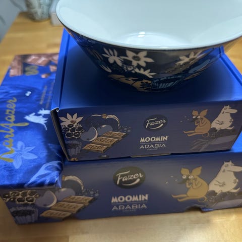 Fazer x Moomin kulho. Pahvipakkaus tallessa.