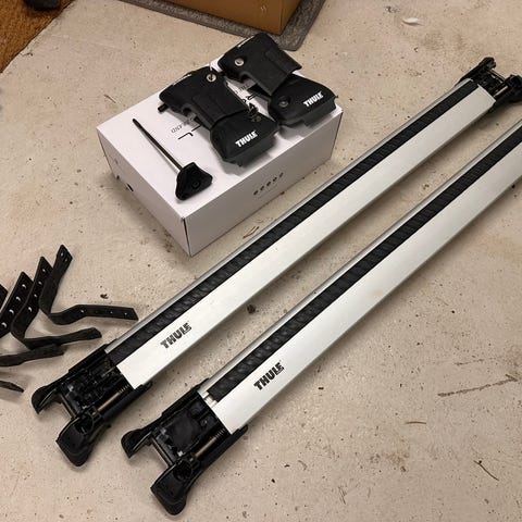 Thule wingbar edge kattoteline. Sisältää kiinnikkeet (thule kit 4023 flush rail) ja osat asennusta varten. Sopii kattokiskoihin auton katolla.