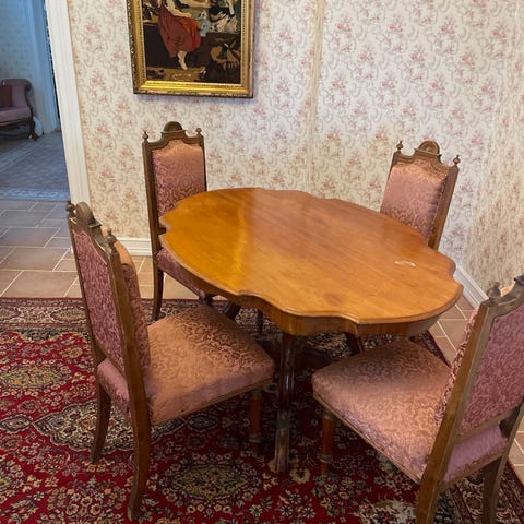 Pöytäryhmä 70-luvulta. Erittäin hyvässä kunnossa. Tuolit ovat jämäkät, ei keiku. Kankaat myös jokaisessa ehjät.