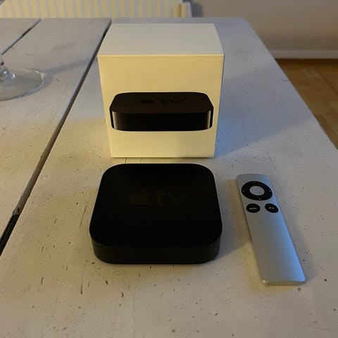 Apple Apple TV mediasoitin, mukana kaukosäädin. Laite on musta, tarkoitettu mediatoistoon televisiossa.