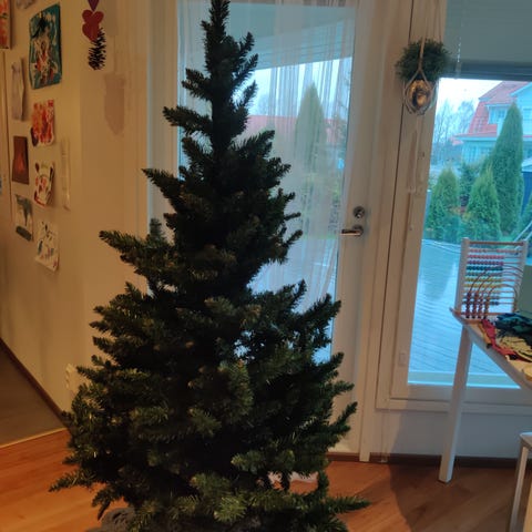 Hyvässä kunnossa oleva joulukuusi jalalla.