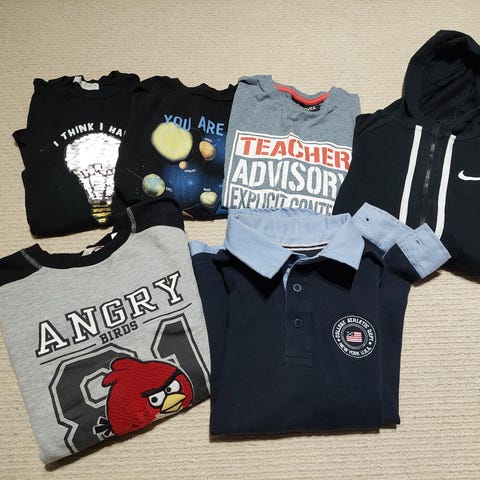 Viiden pitkähihaiset paidan setti. Osa uutta vastaavia, osassa näkyy käytön jälkeä (kuva). Koot vaihtelevat 146/152- 158/164. Menee kuitenkin noin 152 kokoa käyttävälle. Merkkeinä KappAhl, Stadium/Warp, Cupus, Primark.
