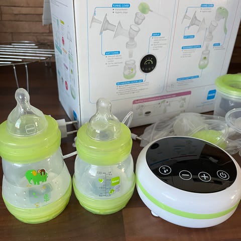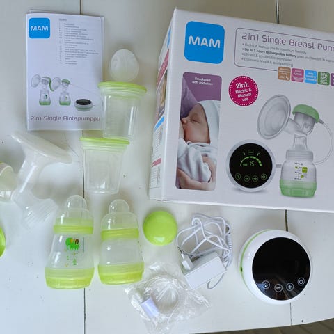 Ainu MAM manuaalinen rintapumppu, täydellinen paketti. Kuvista puuttuu pieni 160ml tuttipullo, tulppa ja korkki pulloon.