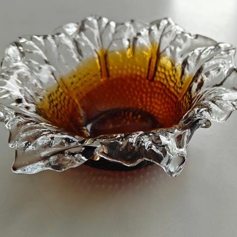 Pertti Santalahden Humppilan lasitehtaalle suunnitteleman Kasvimaalla-sarjan ruskea vati.