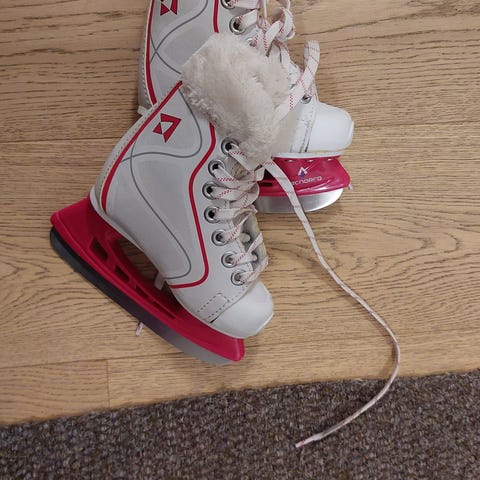 Lasten luistimet, koko 25. Väri valkoinen. Pohjallisen pituus n. 15,8 cm. Eivät tulleet meillä käyttöön ollenkaan ennen pieniksi jäämistä.
