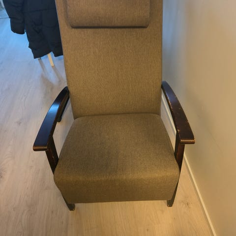 Hyväkuntoinen keinonahkainen (?) nojatuoli. Väri Kerma.