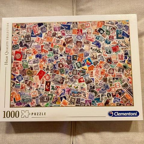 Myydään 1000 palan palapeli, jossa on värikäs postimerkki-aiheinen kuva. Sekä laatikko että palat hyvässä kunnossa, ja kaikki palat tallella.