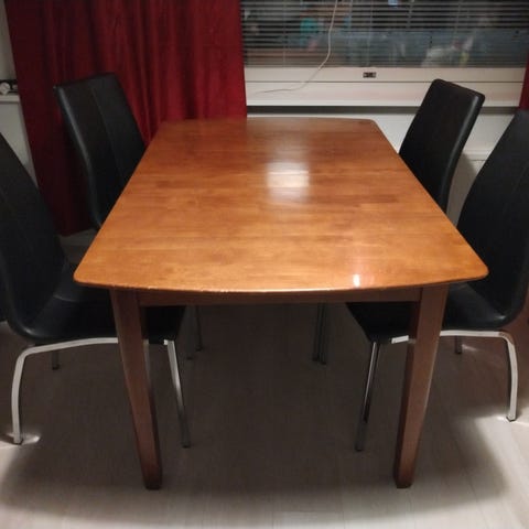 Muutaman vuoden vanha ruokailuryhmä. Pieniä kulumia kannessa, ei käyttöä haittaavaa.