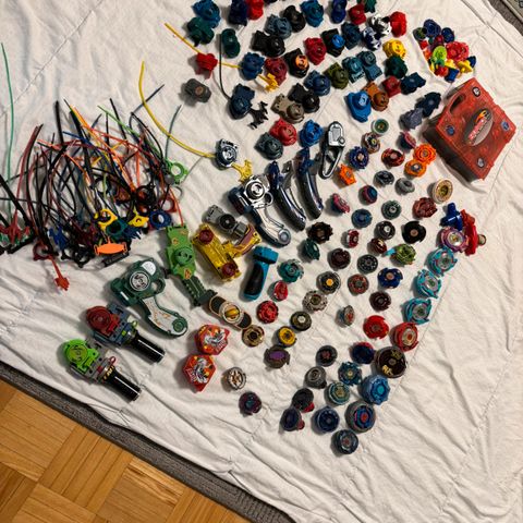 Myydään kuvissa näkyvä Beyblade-setti, jossa kolme hyrrää laukaisimineen, sekä taisteluareena jossa on molemmilla puolilla käsikäyttöiset iskimet, joilla voi vaikuttaa taisteluun.