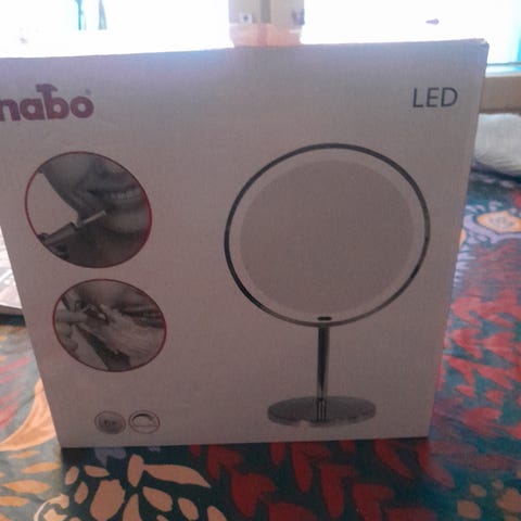 Noda kolmiosainen meikkipeili, jossa on LED-valot. Peili on valkoinen ja siinä on taitettavat sivuosat, jotka tarjoavat laajemman näkymän. Sopii meikkaukseen ja tarkkaan kasvojen hoitoon.