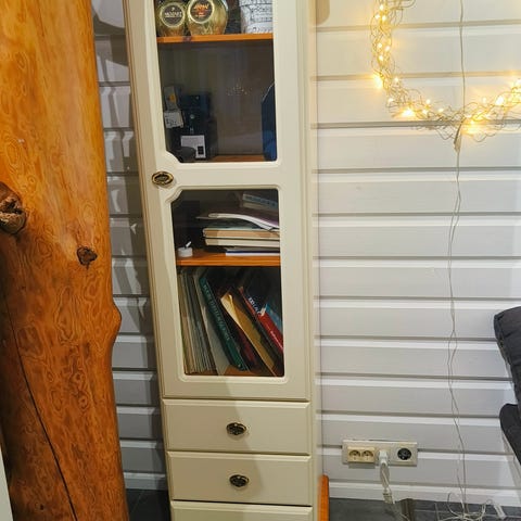Laulumaan Viktoria Vaniljan värinen lasiovellinen vitriini laatikostolla.
