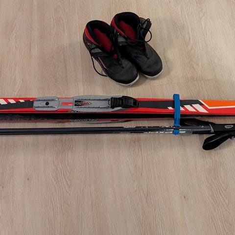 Ertiiäin vähän hiihdellyt 190 senttiä pitkät Atomic Ultragrip sukset, 140 senttiset Järvinen Optima sauvat ja 44 numeron Karhu Touring monot.