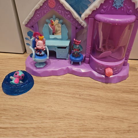 Hatchimals tanssilava jossa kaikki kuvassa näkyneet hachimaalsit ja tarvikkeet ovat mukana. Lavaan saa vaihdettua patterit jos haluaa.