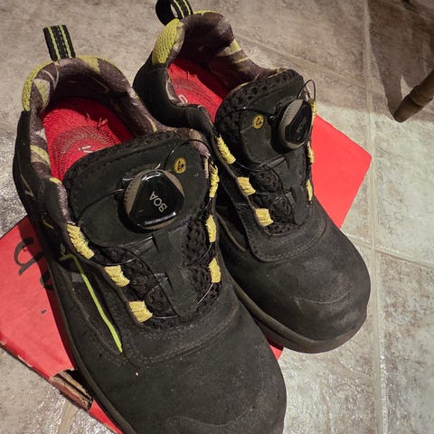 Käytetyt turvakengät joissa sivuilla nimimerkit ( pystyy värittämään päälle ). Mukana sievin punaiset pohjalliset.
