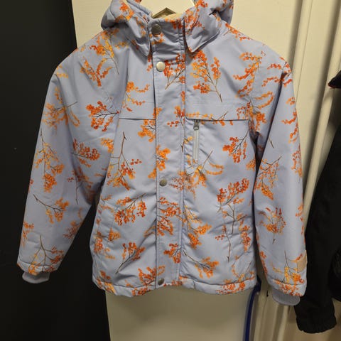 Molo lasten talvitakki koko 128cm, väriltään kirjava kukikas. Valmistettu polyesteristä, sisältä pehmeä fleece-vuori, hihoissa hyvin liukuva vuorikangas. Soveltuu tytöille. Takissa on vetoketjullinen etuosa ja huppu on irroitettava, puolipitkä malli. Heijastin tereitä ja kaksi isoa heijastin tähteä. Lämmin ja rakastettu takki, tullut käytönjälkiä; hiukan kulumaa hihoissa ja takin alareunassa. Tämä huomioitu jo hinnassa. Ihana takki edullisesti!