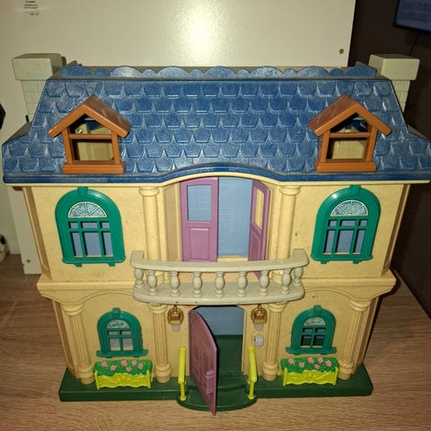 Leikkitalo, jossa mukana useita pieniä lisäosia ja kalusteita. Leikkitalo on muovista valmistettu ja sisältää yksityiskohtia, jotka sopivat lasten leikkeihin.