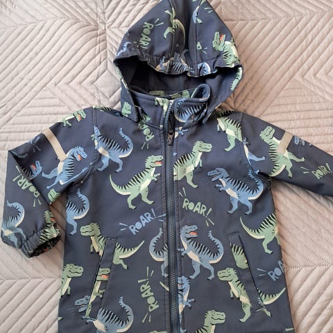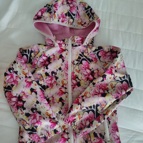 Kaxs softshell-takki 110 cm. Meille uutena ostettu ja en muista tuliko käyttöön ollenkaan vai ei. En huomaa käytön jälkiä, nimitarrasta voi joku hailakka jälki olla tuossa nimikointilapun pinnassa. Hupun saa irti, on neppareilla kiinnitettävä.