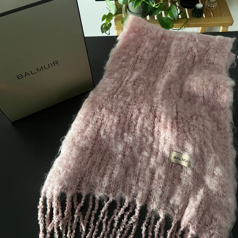 Kauniin vaaleanpunainen Balmuirin kaulahuivi. Kaipaa varmasti huoltoa, ei ole itsellä aikaa tai välineitä huoltaa. On siisti ja ehjä.