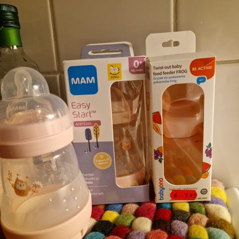 Kaksi lähes käyttämätöntä lasista tuttipulloa. Silikoni vaihtaa väriä jos sisältö liian kuumaa. Näissä vain säilytetty maitoa, tuttiosaa ei ole imetty kertaakaan.