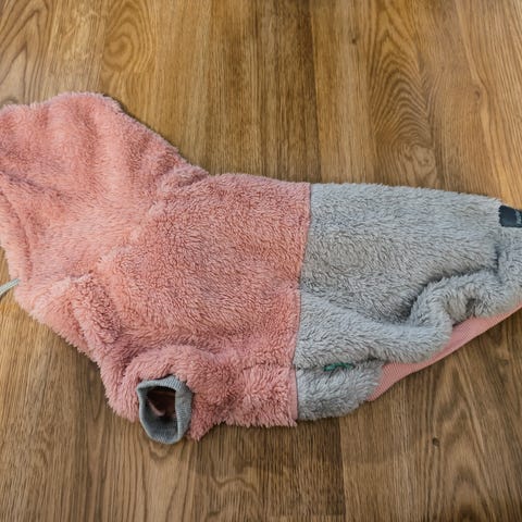 Söpö pörröinen nallehuppari pienelle koiralle, selän pituus n. 38cm leveys n.23cm. Vain muutamia kertoja käytetty, ainoa "vika" kuvassa näkyvä rispaantunut kohta takaosassa, ei kuitenkaan rikki.