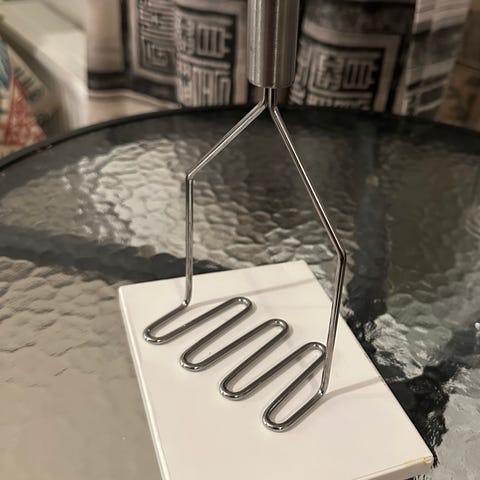 Kätevä perunapuserrin perunoiden ja muiden juuresten pusertamiseen. Kaksi vaihdettavaa terää : hieno ja keskikarkea. Helppo käyttää ja puhdistaa. Vahva ja kestävä runko. -pituus 35 cm -leveys 9 cm -korkeus 12 cm. Käytetty kerran, eli kuin uusi.